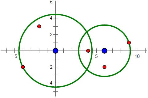 样例中的导弹拦截系统和导弹所在的位置如下图所示。要拦截所有导弹,在满足最小使用代价的前提下,两套系统工作半径的平方分别为20和10。